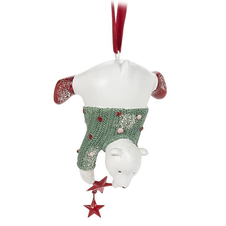 Ajoutez une touche arctique ludique à votre sapin de Noël avec ce ravissant ornement ours suspendus. Fabriqué en résine, cet ours polaire dodu suspendu à sa queue présente de nombreux détails amusants — des paillettes et des pompons sur son pull en tricot à ses bottines ornées de paillettes — pour compléter tout votre décor de vacances.