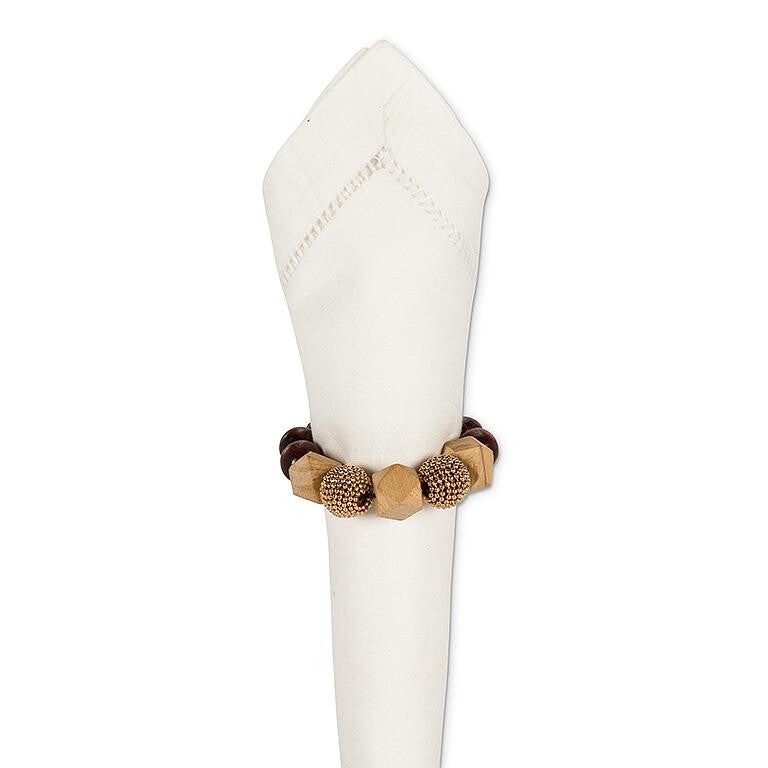 Ajoutez l’accent parfait à n’importe quelle table avec cet élégant rond de serviette en perles. Fabriqué à partir de bois et de plastique, ce rond de serviette présente des perles en bois marron rehaussées de trois perles naturelle au centre et 2 dorées – un look chic qui complète tout, des déjeuners décontractés aux dîners sophistiqués. D'autres styles de ronds de serviette sont également disponibles.