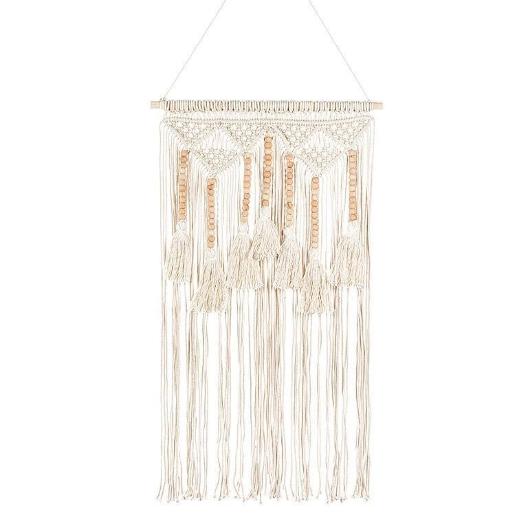 Apportez un style rustique et artisanal à n'importe quel espace avec cette belle suspension murale à franges avec perles et glands. Fabriqué à partir de bois et de coton, le design finement tissé de cette tenture murale, rehaussé de perles de bois de couleur naturelle, constitue un ajout unique et rétro-chic à tout type de décor.