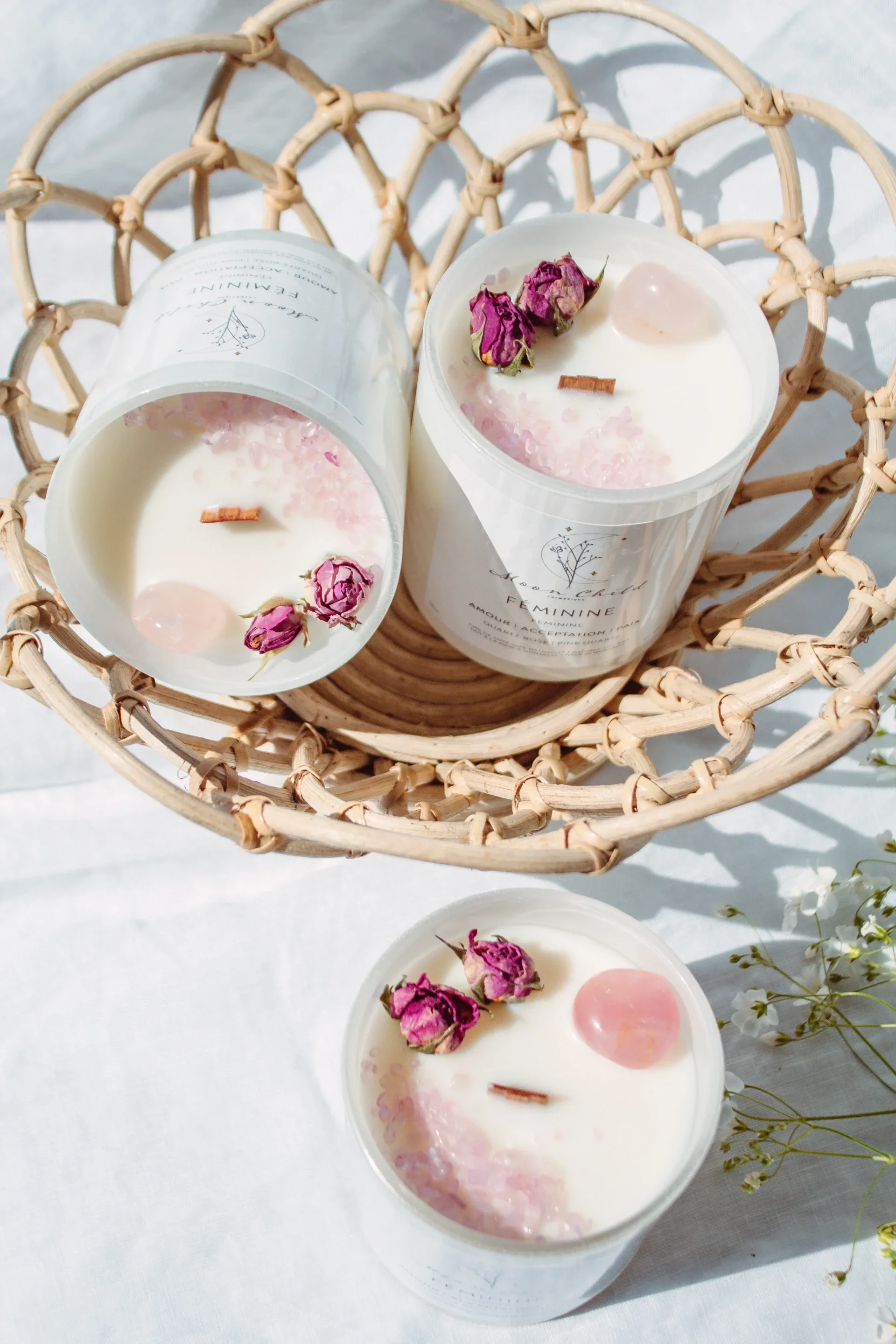 Les chandelles ont une mèche en bois qui crépite ce qui est vraiment relaxant. Nous avons choisi la cire de soya parce qu’elle ne dégage aucune émanation toxique ou fumée noire. Les odeurs sont naturelles, donc légères, sans phtalate et sans paraben. Elles ont toutes des fleurs et un cristal que vous pouvez garder par la suite.