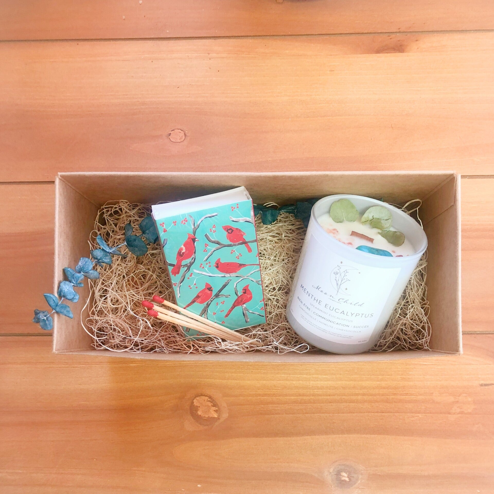 -Une bougie à mèche de bois MoonChild Cosméthique Menthe Eucalyptus.