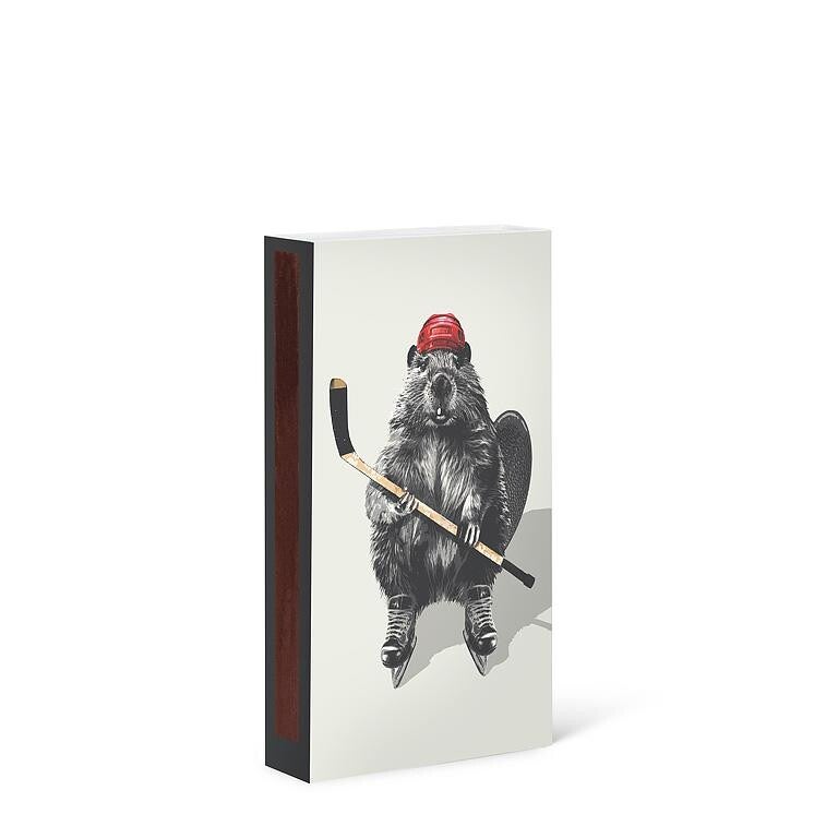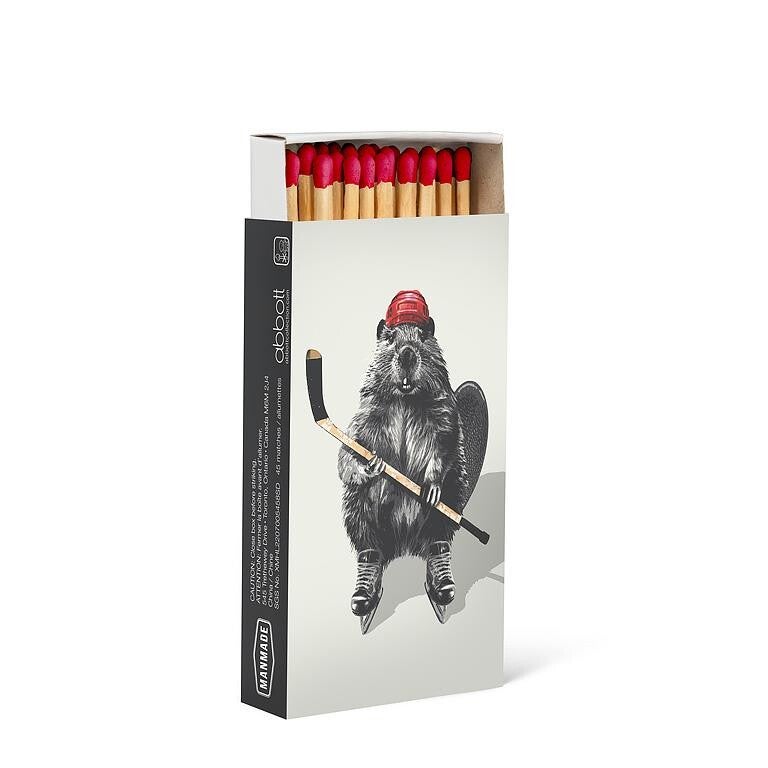 Affichez votre fierté nationale avec ces allumettes Hockey Castor. 45 allumettes est présentées dans une boîte grise et rouge pleine de personnalité. Elles sont parfaites pour allumer des bougies, allumer un feu de cheminée ou alimenter les conversations après un match.